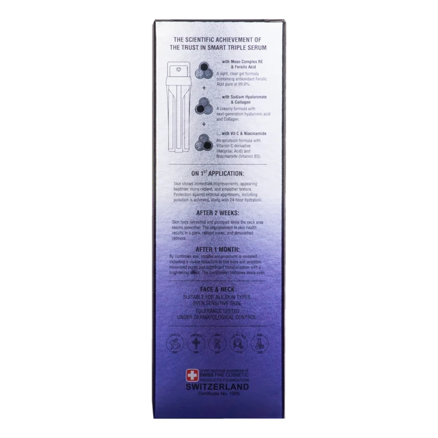مزوکمپلکس مورد استفاده در فرمولاسیون این سرم، با داشتن انواع ترکیبات فعال پپتیدی، آمینواسیدها، هیالورونیکاسید، مواد معدنی و انواع ویتامینها، تاثیر منحصر به فردی در بازسازی و جوانسازی پوست دارد. کلاژن و هیالورونیکاسید مورد استفاده در فرمولاسیون سرم ضد چروک هم بعد از استفاده از سرم بر روی پوست تاثیر همافزایی با مزوکمپلکس و فرولیک در آبرسانی، رفع چین و چروکها و افزایش استحکام پوست دارد. بنابراین سرم سه گانه هوشمند تراست اسمارت با داشتن سه نوع سرم با ترکیبات فعال آبرسان، افزایشدهنده استحکام پوست، جوانکننده و ضد چروک و روشن کننده پوست، به عنوان محصولی متفاوت و بینظیر به بازار معرفی گردید.