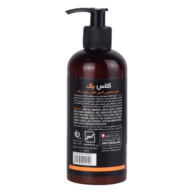 مایع دستشویی کرمی کلاس یک حاوی روغن آرگان، شویندهای ملایم و عمیق است که آلودگیها را پاک کرده و پوست را نرم و مرطوب میکند. این محصول با خواص آنتیاکسیدانی، از پوست در برابر آسیبهای محیطی محافظت کرده و رطوبت آن را حفظ میکند.