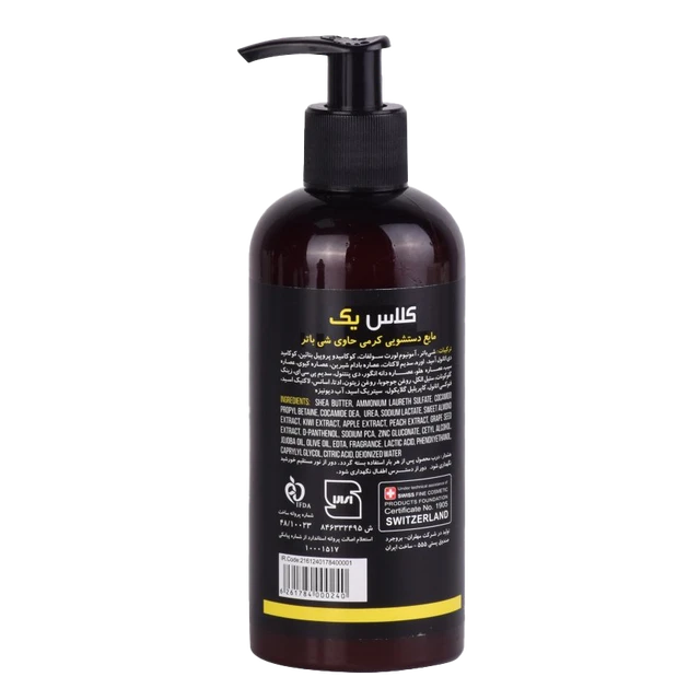 مایع دستشویی کرمی کلاس یک حاوی عصاره شی باتر، علاوه بر پاکسازی پوست از آلودگی‌ها، آن را به‌خوبی نرم کرده و آبرسانی می‌کند. شی باتر موجود در این محصول با داشتن اسیدهای چرب ضروری، سد طبیعی پوست را نیز تقویت می کند.