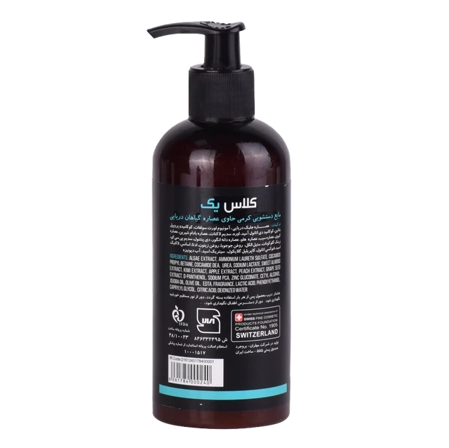 مایع دستشویی کرمی کلاس یک حاوی عصاره گیاهان دریایی، شویندهای عالی برای پاک کردن تمام آلودگیها از روی پوست است. این محصول، با داشتن عصاره جلبک دریایی، یک ضدالتهاب و مرطوبکننده عالی برای پوست است. علاوهبر این، ترشح چربی در پوست را کنترل کرده و پوست شما را روشن میسازد. همچنین این محصول، از فرآیند ترمیم طبیعی پوست حفاظت و پشتیبانی میکند.