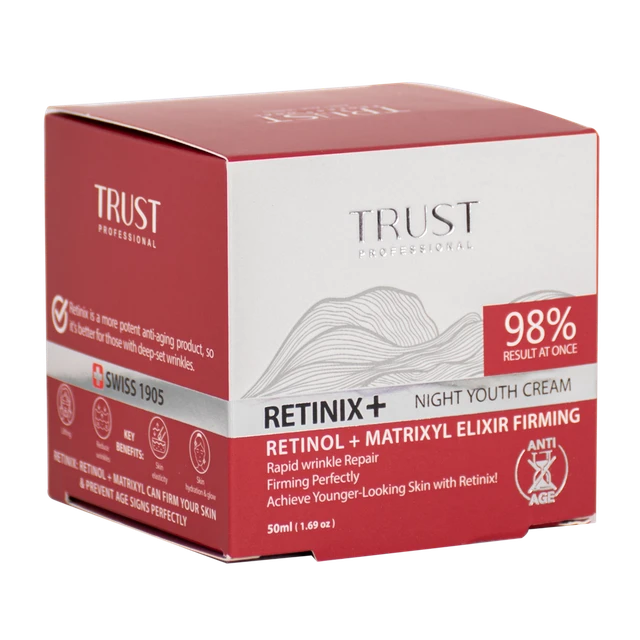 کرم جوانساز رتینول تراست، به واسطه بهرهمندی از ماده مؤثره رتینول و با افزایش تکثیر سلولهای پوستی و افزایش تولید کلاژن در آنها، به بازسازی سلولهای مرده پوستی و افزایش استحکام پوست کمک میکند و با داشتن خواص آنتیاکسیدانی و مهار رادیکالهای آزاد، جلوی ایجاد چینوچروک در پوست را میگیرد. همچنین با داشتن ترکیب فعال ماتریکسیل مورفومیکس، به طرز مؤثری چینوچروکهای صورت، به ویژه خطوط عمودی آن و چروکهای پنجه کلاغی را از بین برده و به تقویت ساختار پوست صورت کمک میکند.