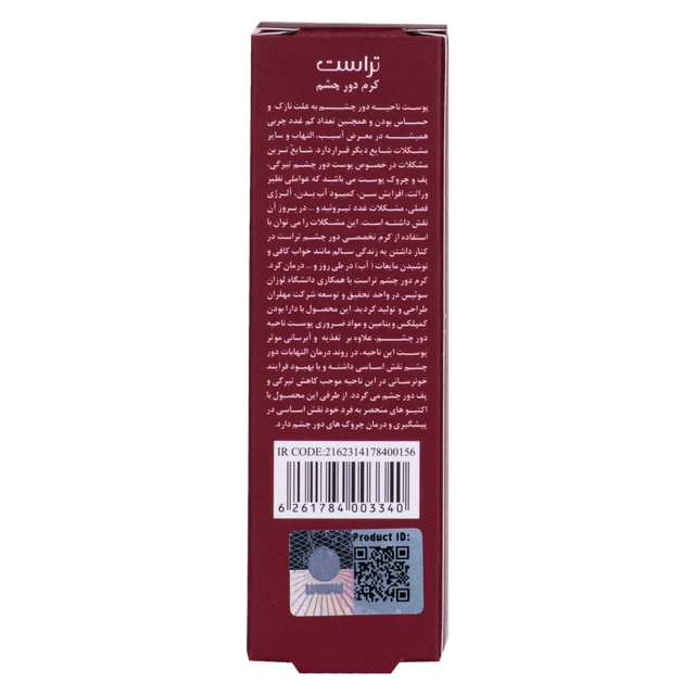 کرم دور چشم تراست با فرمولاسیون خاص خود، به کاهش تیرگی و پف دور چشم کمک کرده و چروکهای خفیف را درمان میکند. این محصول آبرسانی مؤثر و خواص ضد التهابی دارد.