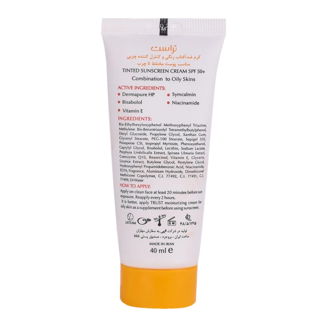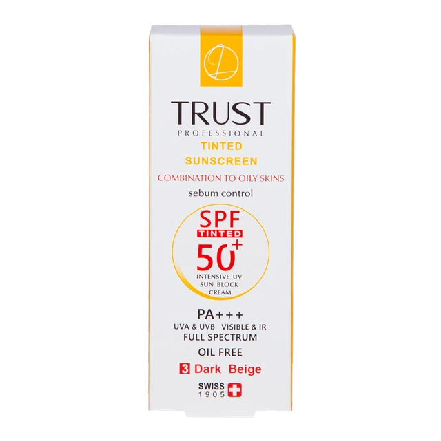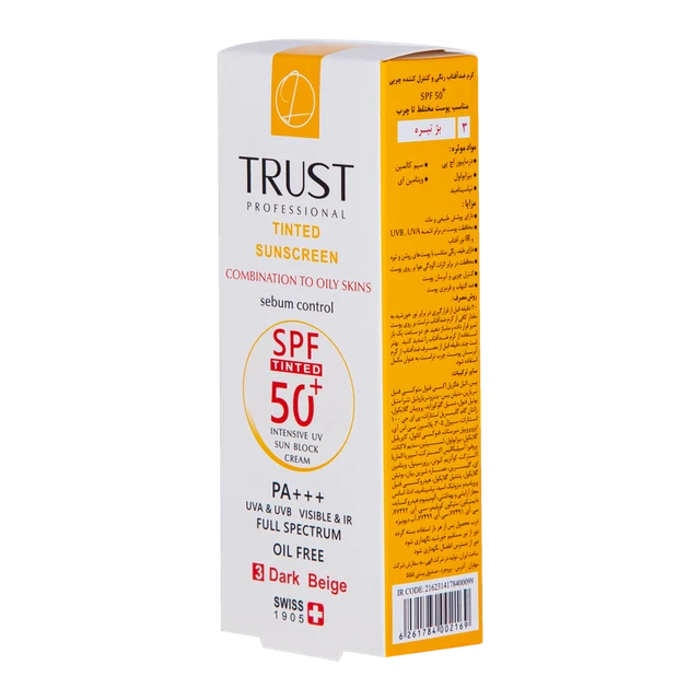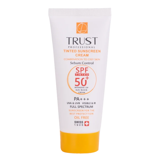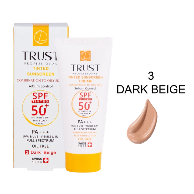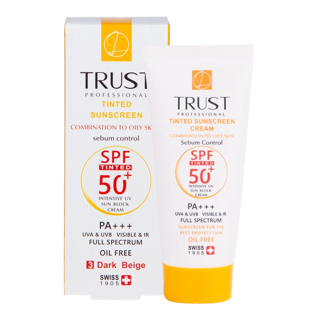 کرمهای ضدآفتاب رنگی تراست از جمله کرم ضد آفتاب رنگی و کنترل چربی بژ تیره با +SPF 50 از مرغوبترین و جدیدترین مواد اولیه موثره دارای حداکثر حفاظت دربرابر پرتوهای مضر خورشید ساخته شدهاند؛ این کرم با وجود بهرهمندی از بافتی سبک، دربرابر آسیبهای وارده توسط نور خورشید به خوبی از پوست محافظت و با مهار رادیکالهای آزاد از تخریب سلولهای پوستی جلوگیری میکند. همچنین با مصرف این محصول، بدون بسته شدن منافذ پوستی و ایجاد خلل در تنفس سلولهای پوستی، ضمن کنترل چربی، پوستتان آبرسانی میشود.